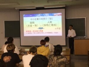 この特別講義は、広島県中小企業家同友会との産学連携を通じて学生によるびんご中小企業研究に関する事業の一環として行われたものです。