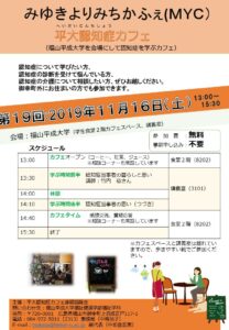 第19回平大認知症カフェ(愛称:みゆきよりみちかふぇ)が、今週11月16日(土)13:00から福山平成大学の学食2階のカフェスペースで開かれます。