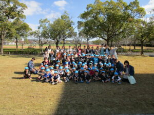 福山平成大学は、豊かな自然環境にあり、こども学科では、その自然環境を生かした授業や活動もたくさん取り入れています。先日、「保育キャリア演習Ⅰ(幼・保)」の授業で、近くのすばる幼稚園さんの園児と一緒に「落ち葉拾い」をおこないました。