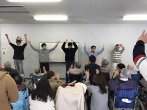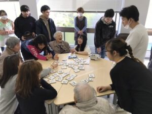学生が考えたプログラムは、体操、的あてゲーム、文字作りゲーム、歌などでした。学生は自分のおばあさんやおじいさんのように積極的に、楽しく関わってくれました。
