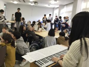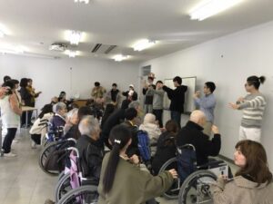 1年生の履修科目「ボランティア活動演習」の授業で、グループホームオリーブハウスの入居者16人と学生34人が交流会をしました。