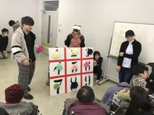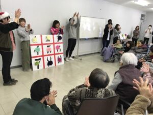 皆さんもとても喜んでくれました。最後に、手作りのプレセントをとしてオリジナル缶バッジをお渡ししました。皆さん、いつまでもお元気でいてください。また、来年お会いしましょう。