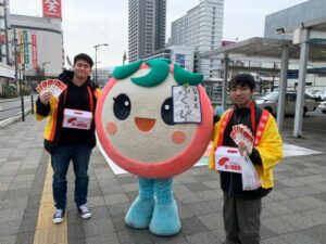 福山駅前にて、道行く人たちに「よろしくお願いします!」と声をかえて協力を募りました。