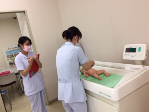 子どもの身体測定(体重・身長・頭囲・胸囲)を、モデル人形にて実施しました。3密を避けるため、少人数のグループで実施しました。【実際に病院で使用している機器を使用】