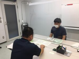 実習指導者からの説明を受けるW君。感染症対策をしながら、まじめに取り組んでいます。