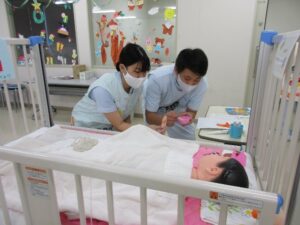 3年が、小児看護学学内実習で、モデル人形を使用してプレパレーションを行っている場面です。