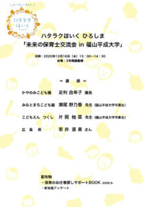来る12月16日に ”ハタラクほいく ひろしま「未来の保育士交流会 in 福山平成大学」”(主催 広島県健康福祉局安心保育推進課)を「保育キャリア演習Ⅰ」の授業内で実施します。