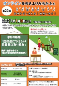 2021年1月9日(土)午後1時から、Zoomを使ってオンラインみゆきよりみちかふぇ(平大認知症カフェ)を再開します。詳細はちらしをご覧ください。