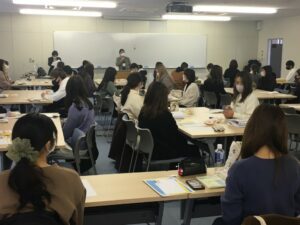 第110回看護師国家試験が来る2月14日実施されます。1月27日に看護学部看護学科では、国家試験を迎える4年生78人の壮行会を新型コロナ感染防止対策のため、2部制として開催しました。 教員より、合格祈願のグッズのプレゼントとエールを受け取り、木宮学部長の挨拶、教員よりの激励、諸注意などを受け、国家試験への気持ちも引き締まりました。