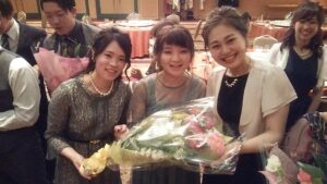 (19年3月の卒業式後の謝恩会にて:3名のうち2名は福山市の小学校教員に)