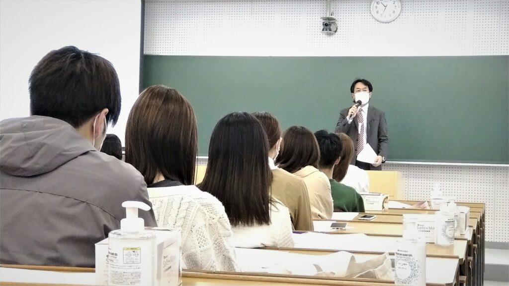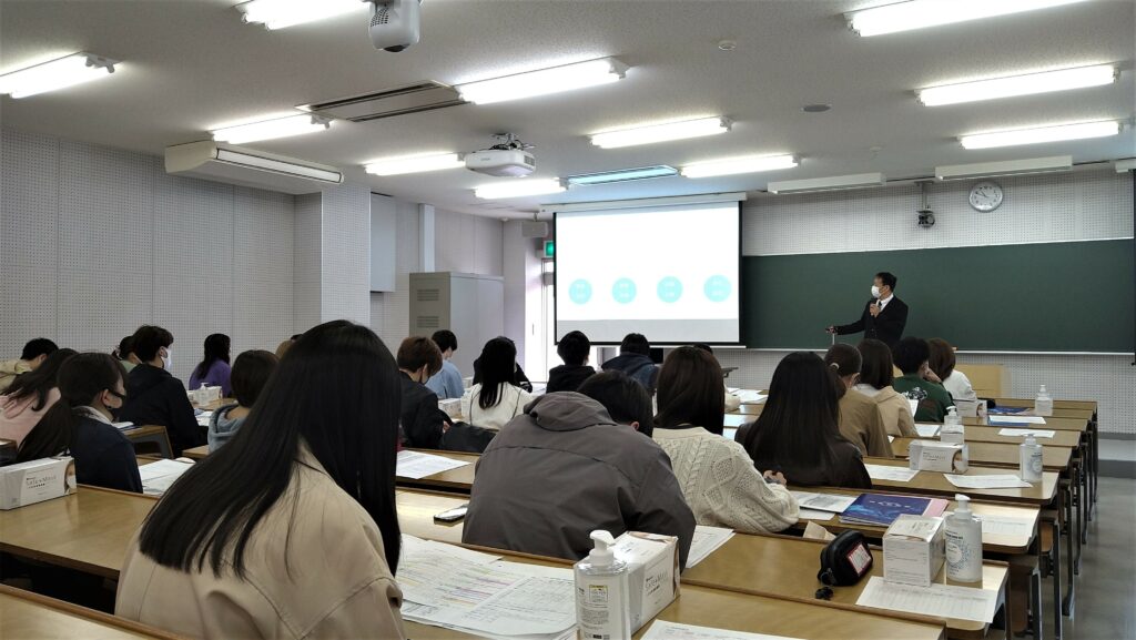学科別オリエンテーションでは、必要な書類に加えて、全ての学生に感染症対策のため、手指消毒用ハンドジェルと使い捨て用不織布マスク一箱が、配布されました。