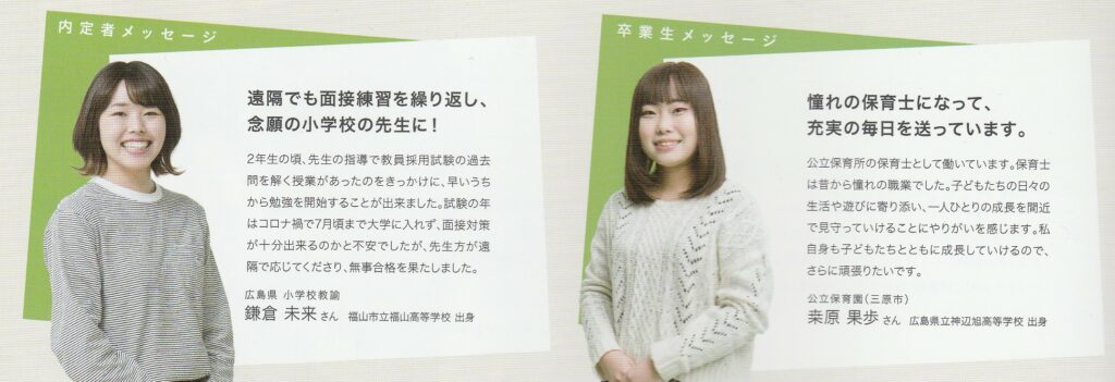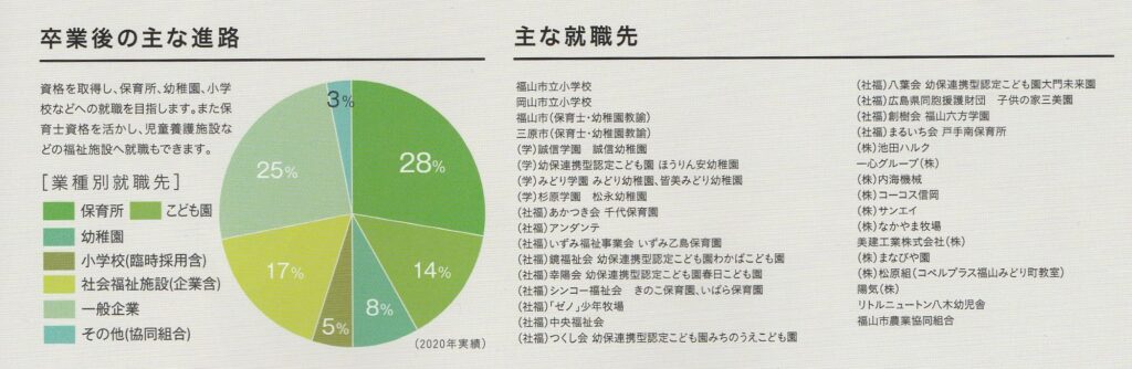 福山平成大学こども学科での、昨年度の就職内定率は100%でした。大学全体でも、全国屈指の就職内定率を誇っています。そのことは、学生たちは、教職員一体となっての手厚い就職支援を受けているということなのですね。