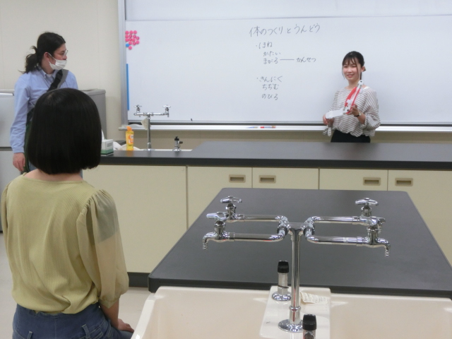 ※こちらは小学校の理科室を模した教室での模擬授業の様子です。すでに各教科で何度も模擬授業を行っている小林さん、さすがに余裕がみえますね! こども学科では、各教員の手厚い指導のもと、実践力を身につけるべく、模擬授業に取り組んでいます。