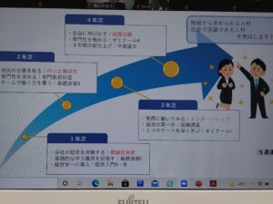 まず、江口学科長より学科紹介があり、大学生活4年間で学ぶこと、取得できる資格、卒業後の進路(就職状況)、経営と経済の違いについて話がありました。