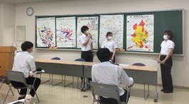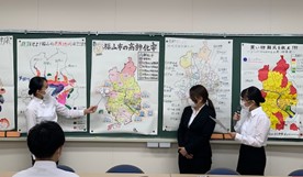 保健師課程の学生が演習の中で、福山市の特産品・高齢化率・河川の氾濫域などを調べ、マップを作成し、発表しました。「地域を知る」ことから保健師の活動は始まると演習を通じて学んでいます。