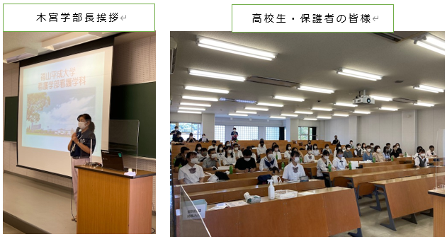 7月11日(日)キャンパス体験会を多数の高校生・保護者の参加を得て、対面にて午前・午後の2部制で開催しました。木宮学部長挨拶、岡学科長挨拶に続いて学科説明、入学者選抜について説明。学生より学生生活の説明。模擬授業では、「新型コロナに負けない手洗いを学ぼう」というテーマで教員・学生の指導の下、衛生学的手洗いを実施しました。その後施設見学および個別相談を実施。参加者から良い評価をいただきました。