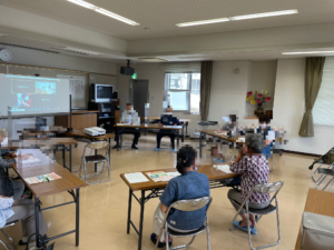 平大認知症カフェは、大学のある御幸町の住民の皆様のための活動でもあります。そのため、事務局を大学教員が務めていますが、コロナ禍でオンラインとなったため、3つのサテライト会場(柳原集会所、正戸集会所、御幸公民館)を設け、ZOOM参加が不得手な地域住民も参加できるようにしています。今回はこのサテライト会場に25人の参加がありました。