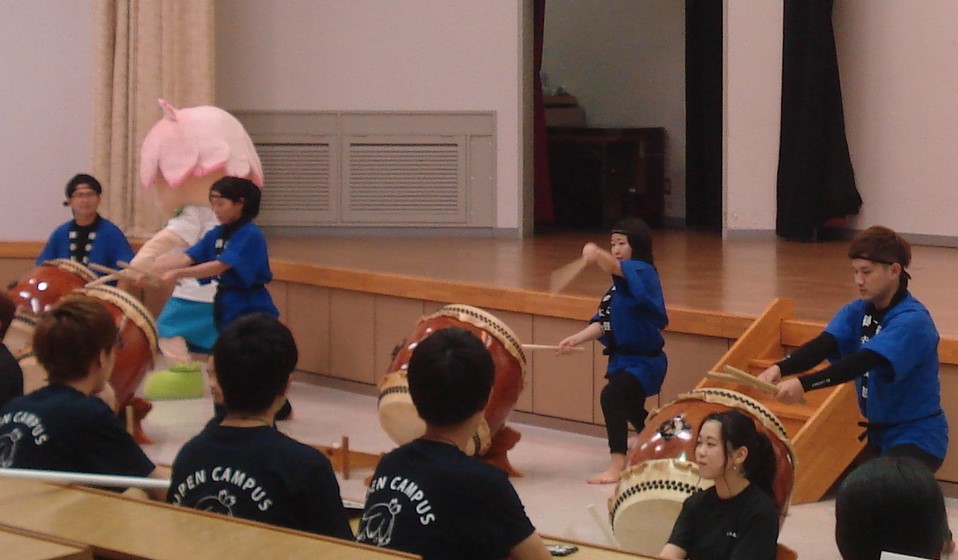 (オープンキャンパスでへいちゃんを被って御幸太鼓を叩く伝説のシーン! 凄い体力です。終わった後、暫く大の字でした。)