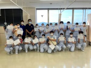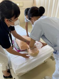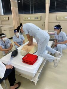看護学科4年生を対象にBLS講習会を開催しました。心肺蘇生、BVM(バックバルブマスク)を使用した人工呼吸、AEDの操作、窒息時の対応について、演習を行いました。4年生は真剣な表情で講習に臨んでいました。