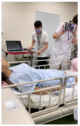 シュミレーターアンを活用し、教員が模擬患者を想定し、学生とteams画面からドレーンやモニターを見せ、アセスメントをして、患者への問いかけをしています。