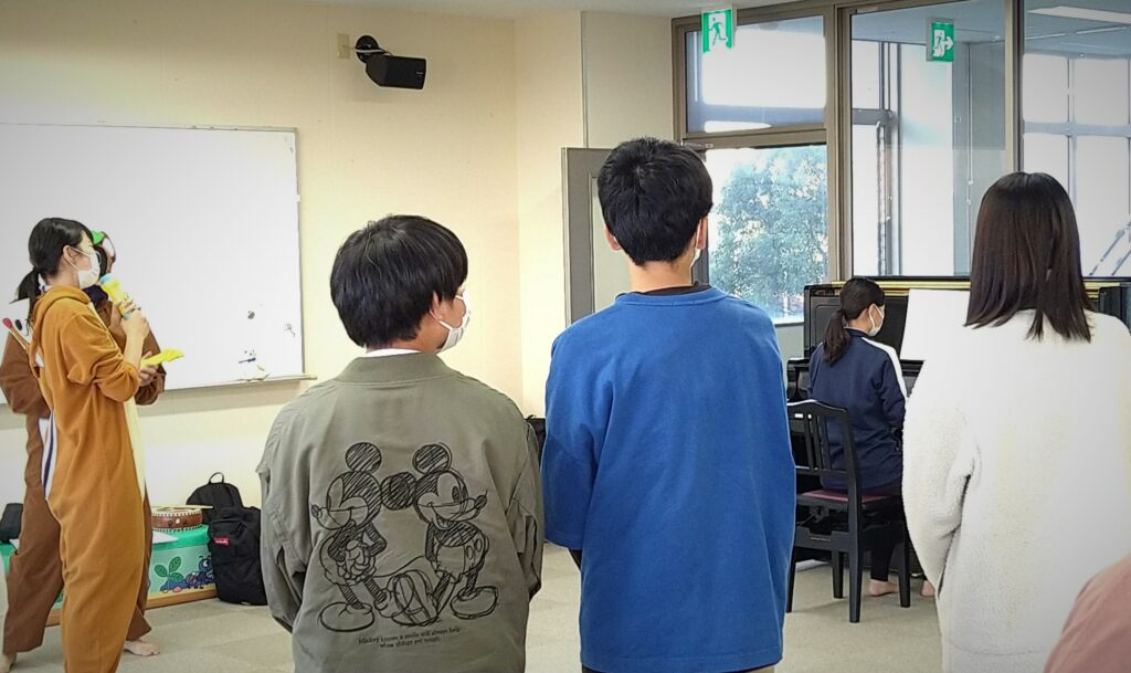 子どもの自律性をひきだす遊びの中から保育を展開していく内容で、学生たちは先生方が弾いて下さるピアノに合わせて歌を歌ったり、「ケイドロ」で本気で走ったりして、楽しい時間を過ごしながら、幼稚園教育を体験出来ました。