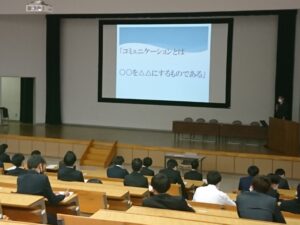 またコミュニケーションが苦手と感じている学生たちには、コミュニケーション力を高めるトレーニングとして、あいさつ+○○+○○(こんにちは、10月なのに、あついですね)というように日常生活の中でも『ツープラス』を意識するだけでトレーニングになる。『話す力』だけではなく、相手の話を引き出せるように、『聴く力』『読む力』を鍛えることも大切であるというお言葉をいただき、学生たちは改めて、社会に出るためにコミュニケーション能力をつけなくてはならないことを考えさせられる貴重な時間となりました。