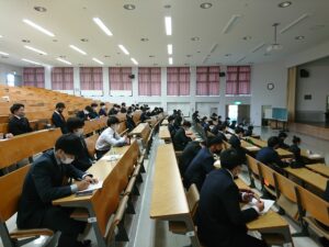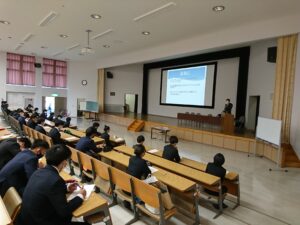 会社が社員に求める第一の能力は、「コミュニケーション能力」であり、具体的に面接時の心得として、「多様化の進んだ状態で相手を納得させながら、異なる意見をすり合わせ、かつその中で自分の能力をアピールしなければならない!」「この会社に入ったら、私は何ができるかということをアピールする!」といった実践的なテクニックを教えていただき、学生たちは、真剣にメモを取っていました。