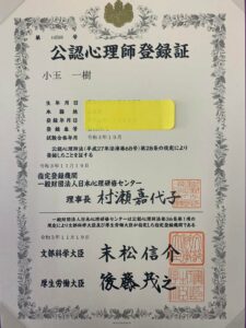 この度、小玉先生は、2021年9月19日に行われた「公認心理師」の国家試験に合格し、令和3年11月19日付けで「公認心理師登録証」が交付されました。