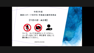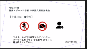 健康スポーツ科学科では、1月22日(土)午前・午後で、令和3年度卒業研究最終発表会を実施しました。今年度も、Zoomおよび録画したプレゼンテーションを視聴する形でのリモート開催となりました。