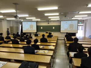 教員から就職活動に関する諸注意を受けた後、卒業を控えた4年生から、動画で体験談とともに就活生に向けたエールが届けられました。