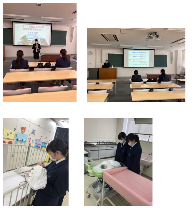 学部長・学科長の挨拶、学科紹介、キャンパスライフの説明後看護学科棟を見学し、新生児モデル人形を抱くなどの体験をしました。