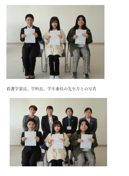 支援、大学祭の運営委員など、大学での学生生活を有意義にするための活動に貢献した学生に福山平成大学学長から感謝状が送られました。
