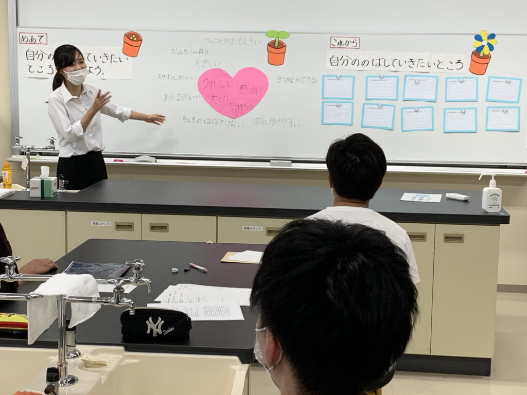 例えば,写真の「初等生活科教育法」では、模擬授業の2週間前と1週間前に、学生自身が作成した「学習指導案」の添削や授業のアドバイスを担当教員(この科目の場合は足立准教授)から受けた上で授業を行います。