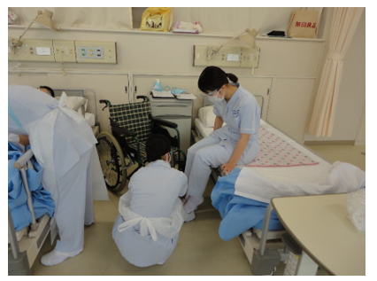 誤嚥性肺炎、認知症で脳梗塞の既往症をもつ高齢の患者を想定して、ベッドから車いすへの移動の援助について演習を行いました。患者さんにどのように説明すればうまく伝わるのか、何をどこまで介助するのか悩みながら実施しました。