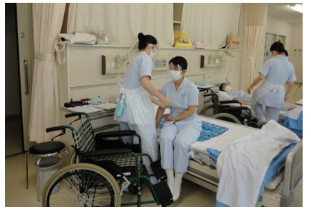 【看護学科】3年生、「老年看護援助学Ⅱ」の授業で移動の援助の演習を行いました。