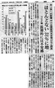 経営学科の堀越教授と宗像講師が行った調査結果が、今年7月20日付け中國新聞に掲載されました。掲載されたのは、一昨年から、広島県中小企業家同友会福山支部と一緒に行っている「Covid-19の中小企業経営への影響に関する調査」の一部です。