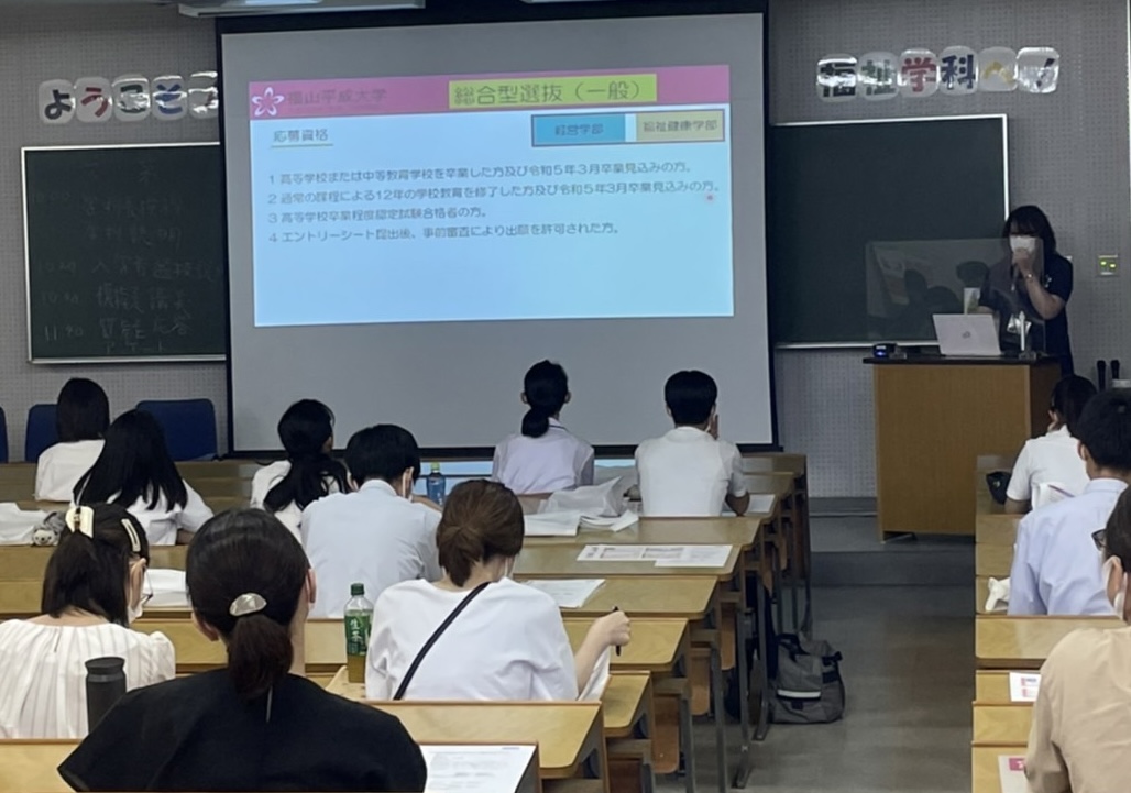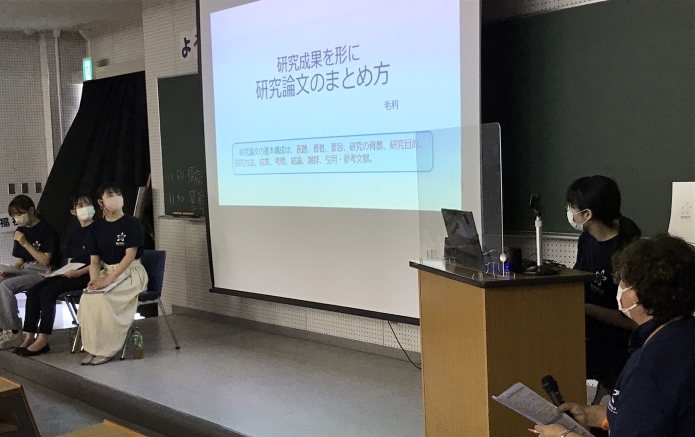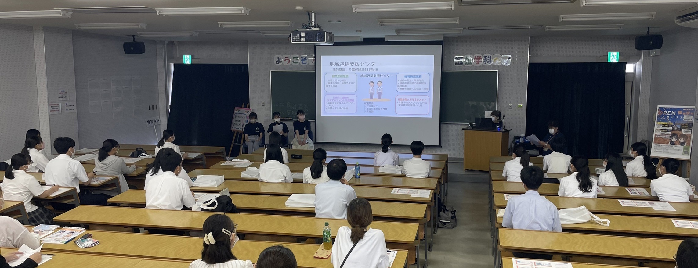 模擬授業では、中司ゼミが普段行っている1.最近のニュースの共有、2.実習準備の進捗状況の報告、3.卒業論文の途中経過の発表、4.ゼミ活動のオンライン認知症カフェ「みゆきよりみちかふぇ」の司会、運営の報告の様子をご覧にいれました。ロシアとウクライナの戦争が日本の私たちの生活に波及していること、来年日本でG7広島サミットが開かれることについてゼミ生が語ると、会場の高校生の皆さんが新型コロナの新規感染者が20万人を超えたこと、宗教統一教会が話題になっていること、物価高の日本に関心があることなどを話してくれました。