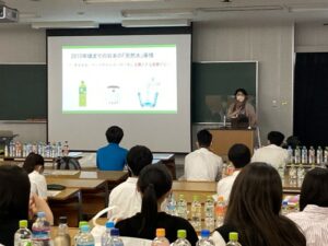 講義では、高校生と保護者の方には実際に店頭で販売されている「お水」を手に取ってもらいました。