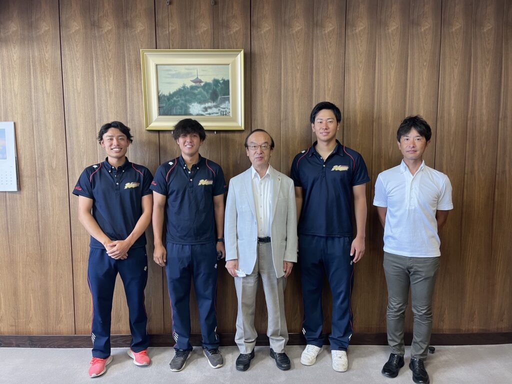 本学科の石橋勇教授(部長)、高本健彦准教授(監督)、佐藤奨晟さん(健スポ3年)、正田隼己さん(健スポ4年)、山本陽太さん(健スポ4年)が、学長室を表敬訪問しました。大会出場に向けて激励のお言葉をいただきました。