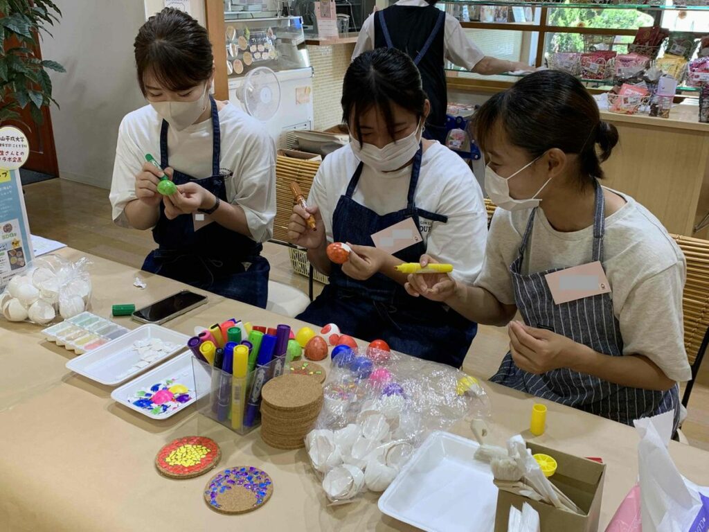 今回は、こども学科の学生達が発案した「卵の殻を使ったモザイクコースター」を学生と子ども達が一緒に作りました。