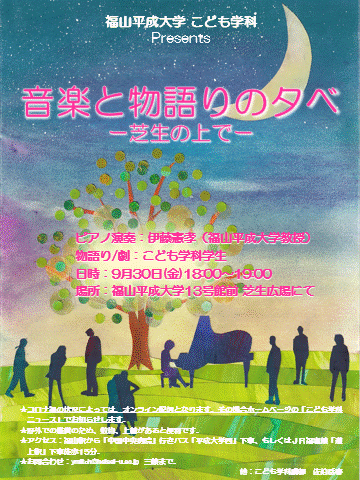 こども学科では9月30日に「音楽と物語の夕べ―芝生の上で―」を行います。ここ2年間は、コロナ禍のため実施できなかったのですが、今年は何とか実現できそうです。