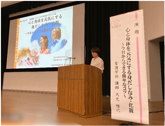 「心と身体を元気にする身だしなみ・化粧 ~今日からできる簡単なコツ~」について、看護学部看護学科の大元雅代講師が講演し、約80人の方が受講されました。
