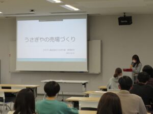 講義では,クラブン株式会社が展開する文具店「うさぎや」の概要を説明していただいたあと,店頭での商品の展示方法やポップの作り方など,店頭での具体的な例を挙げながら,お話しくださいました。
