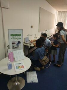 出展では小・中学生を対象に、青木講師が開発したモーションキャプチャシステムを用い、じゃんけんを試してみたり、折り紙を折ったり、はさみで切ってみたりする活動を体験してもらいました。