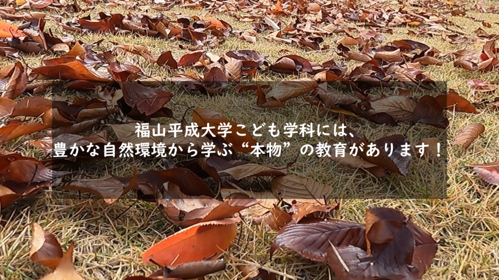 福山平成大学こども学科では、「落ち葉をひろって遊ぼう!」と題した行事が行われました。これは自然豊かなキャンパスを生かし、子どもたちと一緒に落ち葉をひろい遊びながら、自然に親しむことを目的としています。