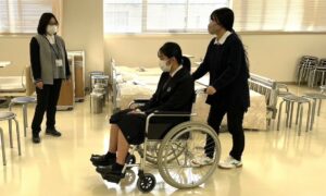 高校生の皆さんは、ドキドキ緊張しながら安全に移動できるように一生懸命に車椅子操作をしておられました。
