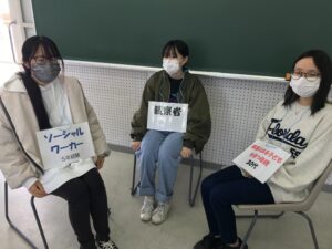 今回のロールプレイでは、大学生がその背景や状況、登場人物を設定し、将来相談援助業務をやっていく中で、どのような情報や関りが必要であるかを考えながら、発表を行い考察したのち省察しました。