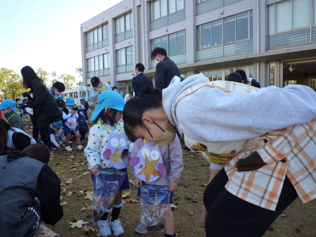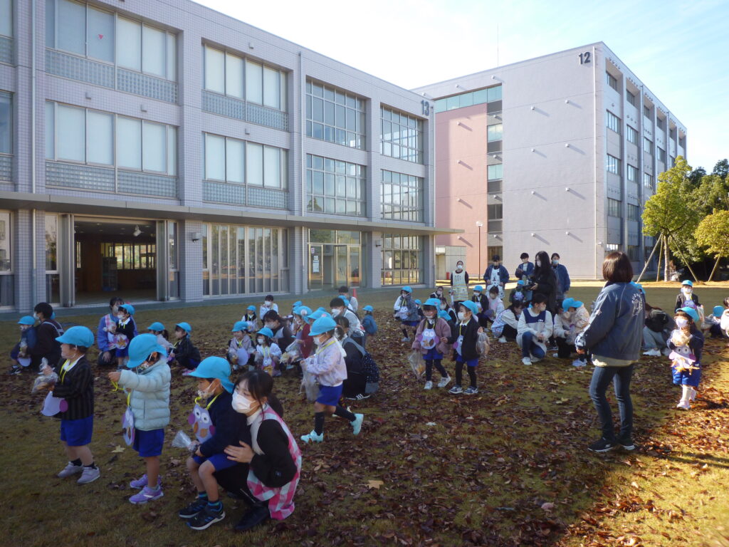 「保育実地体験Ⅱ」を履修している2年生の学生と、「保育キャリア演習Ⅰ」を履修している3年生の学生とで、子どもたちをお迎えしました。到着後は、ペープサート「赤ずきんちゃん」を見てもらい、学生と一緒に「ふくろう」を製作し、いよいよ「落ち葉をひろって遊ぼう!」への準備万端です。