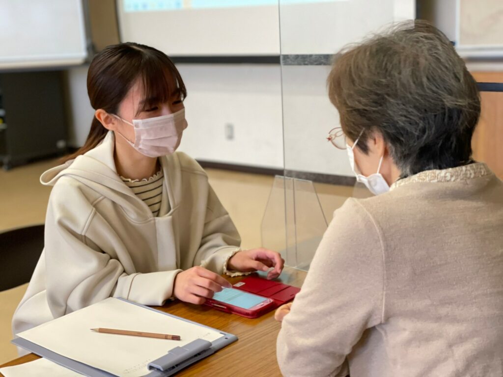 そこで「スマホ相談会」を、スマートフォン所有の高齢者の相談を学生が対応する方法で行いました。「文字の打ち方がわからない」「アプリのダウンロードの仕方がわからない」「迷惑メールをどうしたらいいか分からない」といった疑問を学生が丁寧に対応して解消していきました。