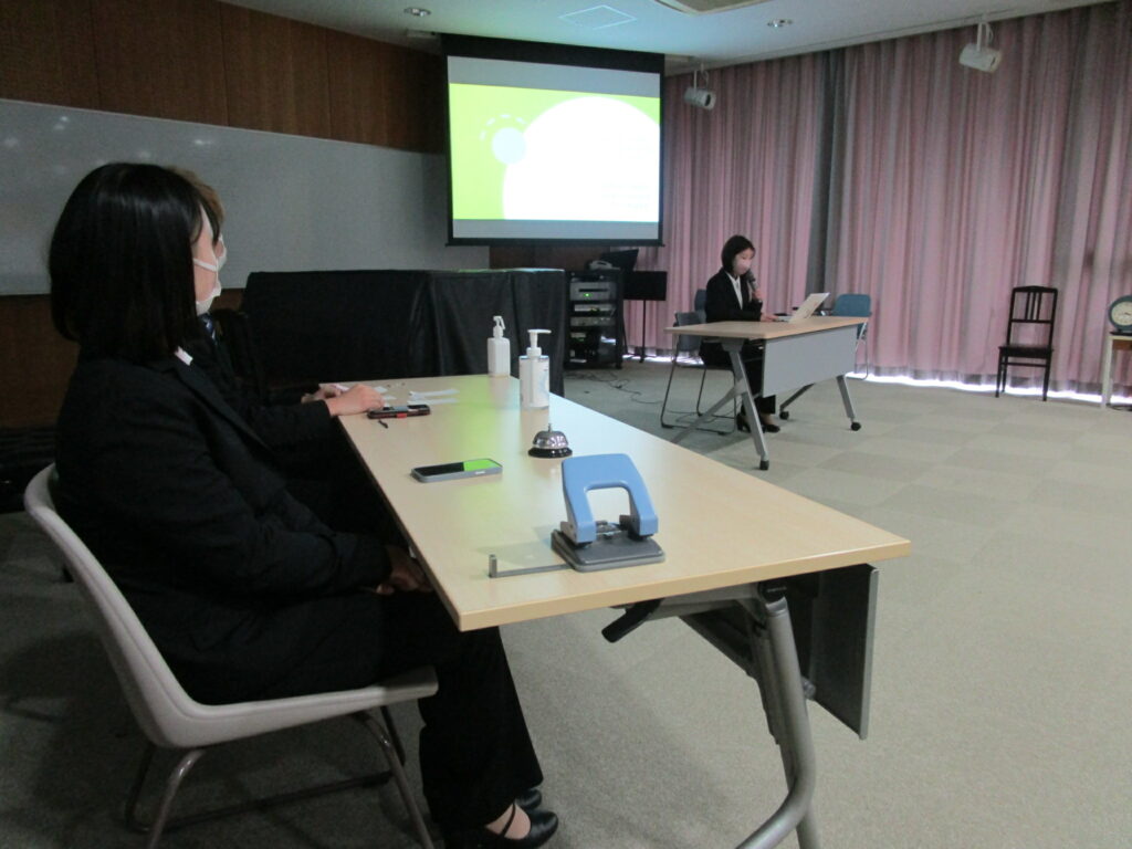 ↑ 河村さんの研究は「子どもの発達に影響を与える絵本の読み聞かせについて」。絵本の歴史から読み聞かせの実態、意義、年齢別のおすすめ絵本へと考察を進めました。2年生で制作した「デジタル絵本」の経験が生きたとても見やすいプレゼン資料でした。